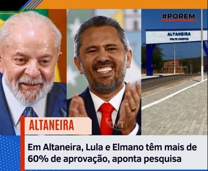 O presidente Lula (PT) e o governador Elmano de Freitas (PT) têm aprovação acima de 60% em Altaneira, no Cariri, conforme pesquisa de opinião divulgada na última sexta-feira (7) pela DataCidad Consultoria e Publicidade. O levantamento ouviu moradores da sede e da zona rural do município nos dias 2 e 3 de novembro.
